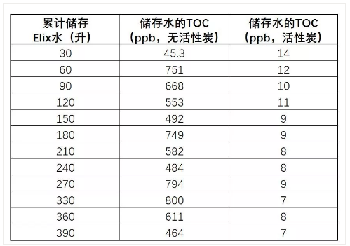 下圖顯示了空氣過濾器有/無活性炭的儲(chǔ)水系統(tǒng)中TOC水平。從數(shù)據(jù)中可以看出,達(dá)到平衡后,無活性炭的空氣過濾器比有活性炭的空氣過濾器的儲(chǔ)水系統(tǒng)中的TOC含量高60-100倍。