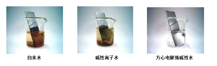將SPCC板分別浸泡在裝有自來(lái)水、堿性離子水、和PH值為11.7的強(qiáng)電解堿性水的燒瓶中,室溫下放置8天觀察,浸泡在自來(lái)水中的SPCC板只過(guò)了2個(gè)小時(shí)即已開(kāi)始生銹,而浸泡在碳酸鉀堿性電解水中的SPCC板經(jīng)過(guò)了8天也未生銹。