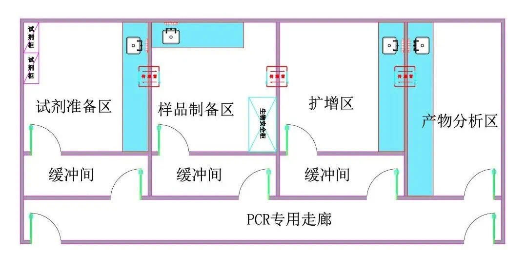 PCR實驗室原則.上分為四個單獨的工作區(qū)域:試劑準備區(qū)、標本制備區(qū)、擴增區(qū)和擴增產物分析區(qū)。為避免交叉污染,進入各個工作區(qū)域必須嚴格遵循單一方向原則,即只能從試劑準備區(qū)→標本制備區(qū)擴增區(qū)>擴增產物分析區(qū),不得逆向流動,并且各區(qū)完全獨立,如為一個區(qū)套一個區(qū)的模式,區(qū)間不能直通,則必須建有緩沖間,保證兩個區(qū)域間始終處于隔離狀態(tài)。