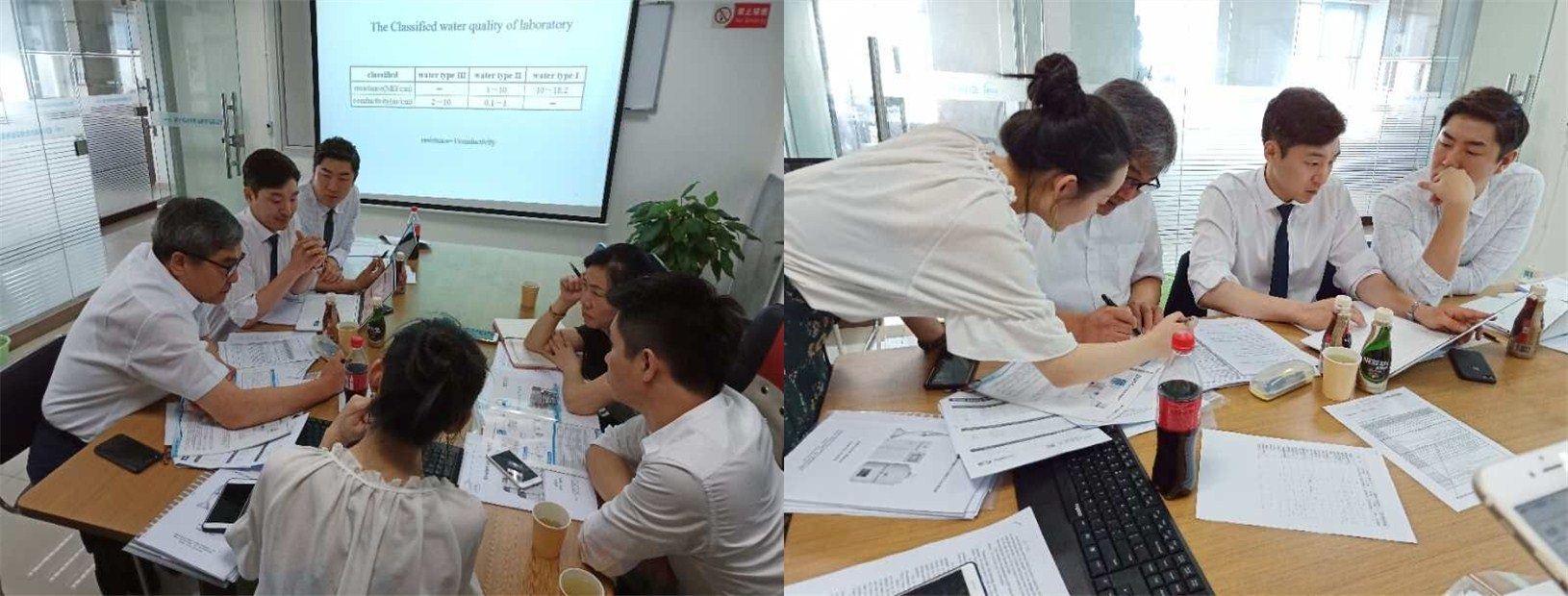 2018年8月6號上午,韓國客戶一行三人到我司進行深度的產(chǎn)品技術(shù)交流和知識學(xué)習(xí)。首先客戶參觀我司樣品展示廳的實驗室超純水機,對產(chǎn)品有了初步的了解和認(rèn)識。隨后,外貿(mào)部業(yè)務(wù)員對客戶一 一介紹了實驗室超純水機的各類型號、工作流程和原理、水質(zhì)標(biāo)準(zhǔn)、操作界面、再到售后產(chǎn)品維護和更換耗材??蛻粼诋a(chǎn)品知識學(xué)習(xí)當(dāng)中,提出了很多技術(shù)上的問題和疑惑以及要求和對應(yīng)的解決方案。外貿(mào)部業(yè)務(wù)員和技術(shù)主管一步一步解答客戶所提的問題和要求。