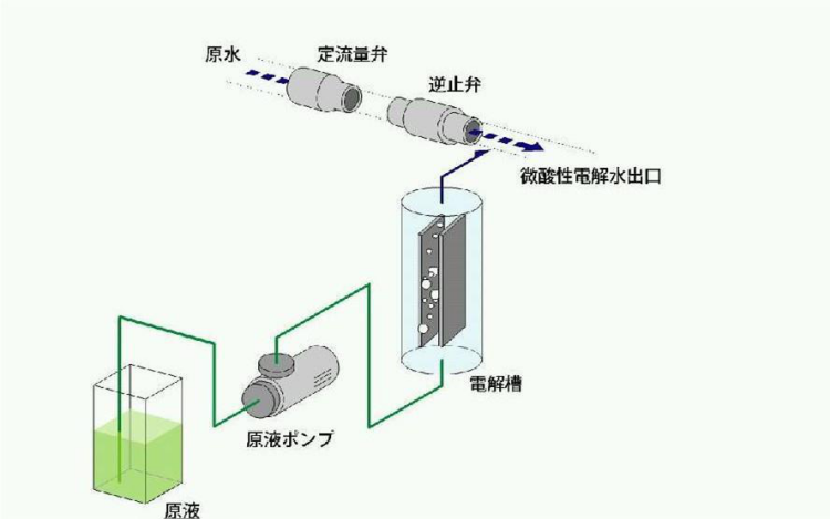 強酸性電解水采用卓越ZY-LAEB系列電解槽、通過低電壓電解方式制成的。在陽極中2HCl一H+ +Cl-,生成的Cl+又與HO-反應(yīng)生成了次氯酸(HOCI)和鹽酸(HCl)。在原水的緩沖下,pH變?yōu)?.0 - 6.5,有效氯濃度為10-30ppm(只有強酸水的1/4以下),氯離子(Cl-)濃度低是這種強酸性電解水的顯著特征。在強酸性電解水的生成過程中,除了生成有殺菌效果的氯外,不再產(chǎn)生氧或臭氧,不會生成氯的高次氧化物如HClO2、HClO3、HClO4等,溶存氧、臭氧、氯氧化物等副生成物的濃度較低,綠色環(huán)保;生成的強酸性電解水為無色透明非粘性液體,含有次氯酸,無味或是略呈氯臭,其pH值接近7,決定它對人體的危害更小,對物體幾乎沒有腐蝕性。強酸性電解水作用后發(fā)生氧化還原反應(yīng)生成水,原料中不含鹽,使用后即使干燥也不會因為鹽的濃縮和結(jié)晶帶來弊害。