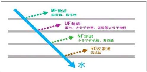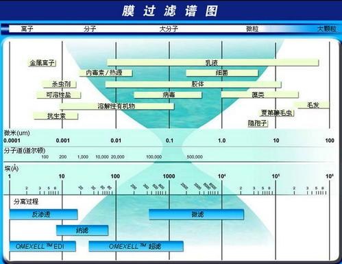 分離膜是具有選擇性分離功能的材料,利用膜的選擇性分離實現(xiàn)料液的不同組分的分離、純化、濃縮的過程稱作膜分離。它與傳統(tǒng)過濾的不同在于,膜可以在分子范圍內(nèi)進(jìn)行分離,并且這過程是一種物理過程,不需發(fā)生相的變化和添加助劑。膜的孔徑一般為微米級,依據(jù)其孔徑的不同(或稱為截留分子量),可將膜分為微濾膜、超濾膜、納濾膜和反滲透膜,根據(jù)材料的不同,可分為無機(jī)膜和有機(jī)膜,無機(jī)膜主要是陶瓷膜和金屬膜,其過濾精度較低,選擇性較小。有機(jī)膜是由高分子材料做成的,如醋酸纖維素、芳香族聚酰胺、聚醚砜、聚氟聚合物等等。錯流膜工藝中各種膜的分離與截留性能以膜的孔徑和截留分子量來加以區(qū)別,下圖簡單示意了四種不同的膜分離過程:(箭頭反射表示該物質(zhì)無法透過膜而被截留):