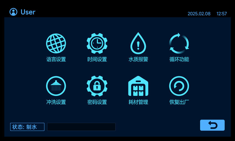★全自動微電腦控制,7寸彩色觸摸屏人機(jī)操作界面(尺寸1540*85mm),動畫顯示工作模式,中英文雙語言自由切換,圖示化顯示耗材壽命、儲水狀態(tài)、水質(zhì)狀態(tài)等運(yùn)行參數(shù),可選配物聯(lián)網(wǎng)(LOT)和云端遠(yuǎn)程管理平臺,實(shí)現(xiàn)遠(yuǎn)程診斷、監(jiān)控、日常操作及儀器和云端雙備份運(yùn)行數(shù)據(jù)信息。